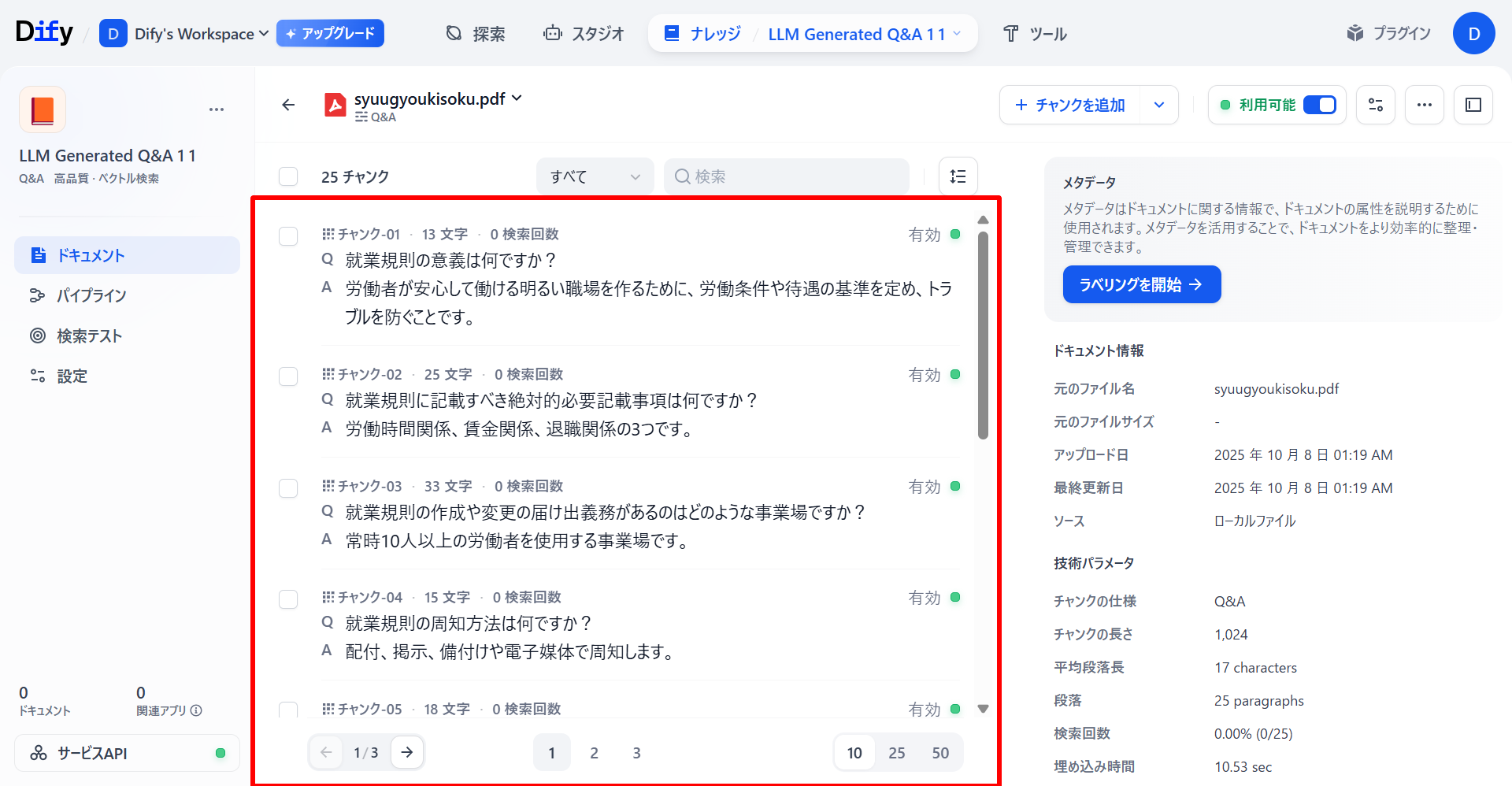以下のように、チャンクごとに質問と回答がセットになったQ&A形式で保存されます。
