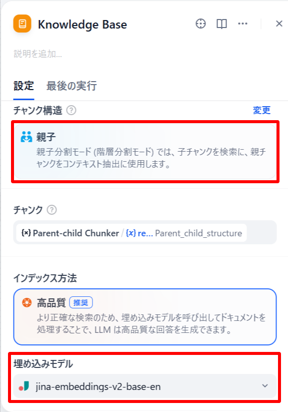 - 「KNOWLEDGE BASE」ブロックにチャンク構造が「親子」になっていることを確認し、埋め込みモデルを設定します。
