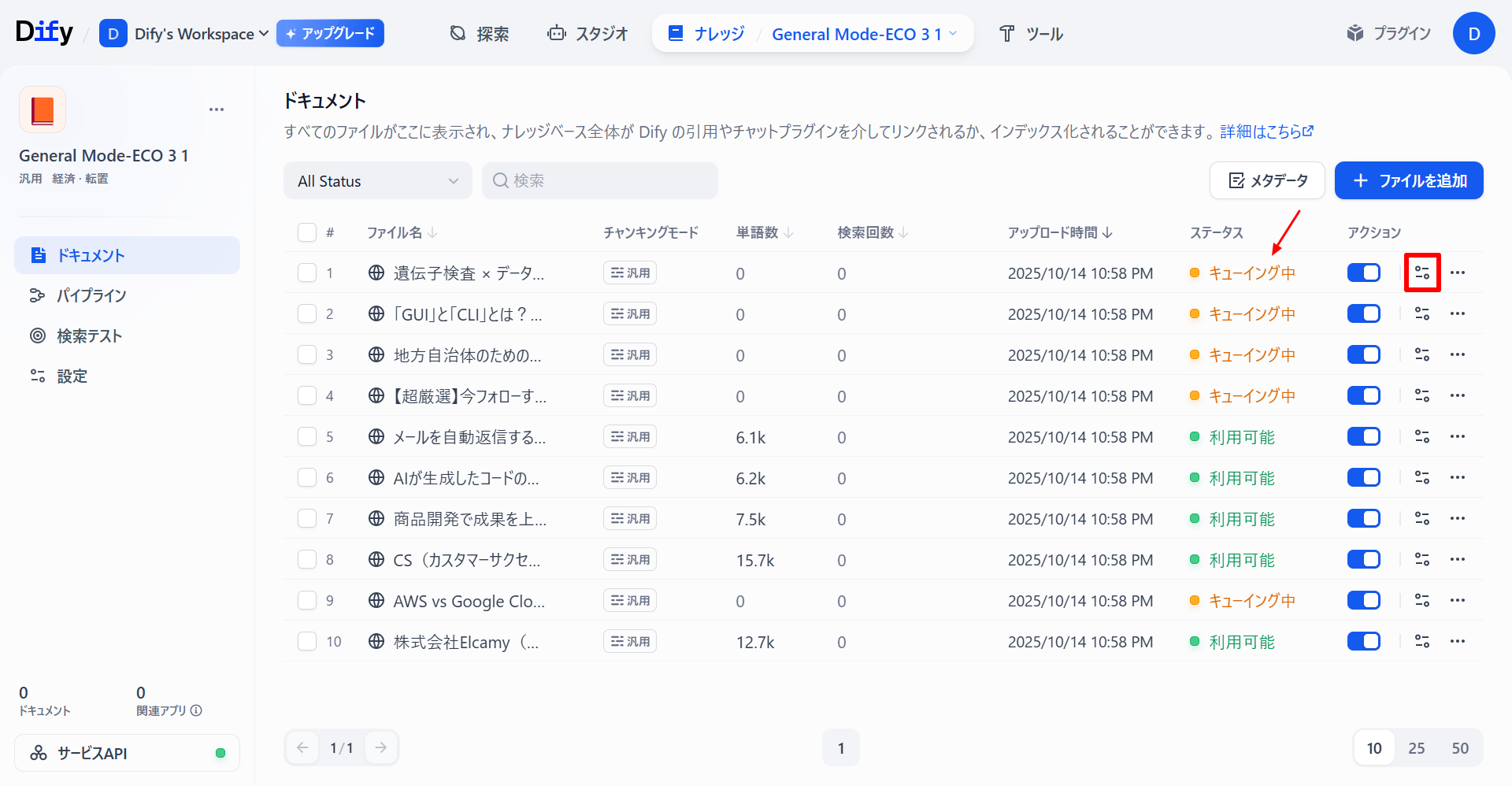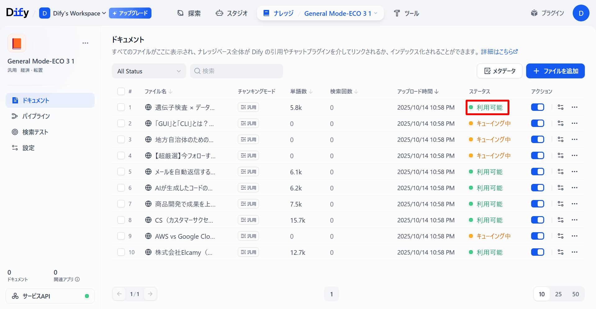 該当のナレッジのステータスが「利用可能」になっていれば処理は完了しています。すべての「キューイング中」であるナレッジベースについて同じ処理をします。
