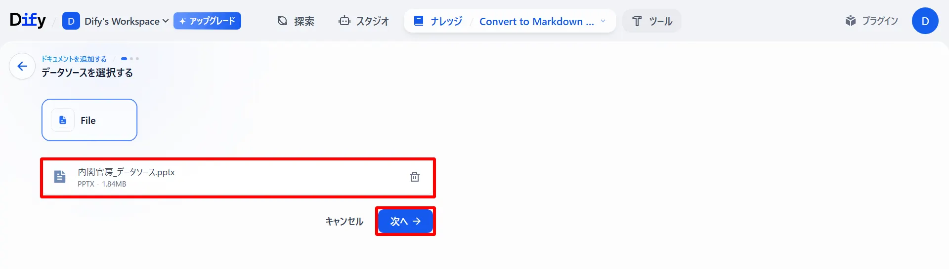 - 「ドキュメント」タブから「ファイルを追加」を選択し、「FILE」からデータソースを入力します。