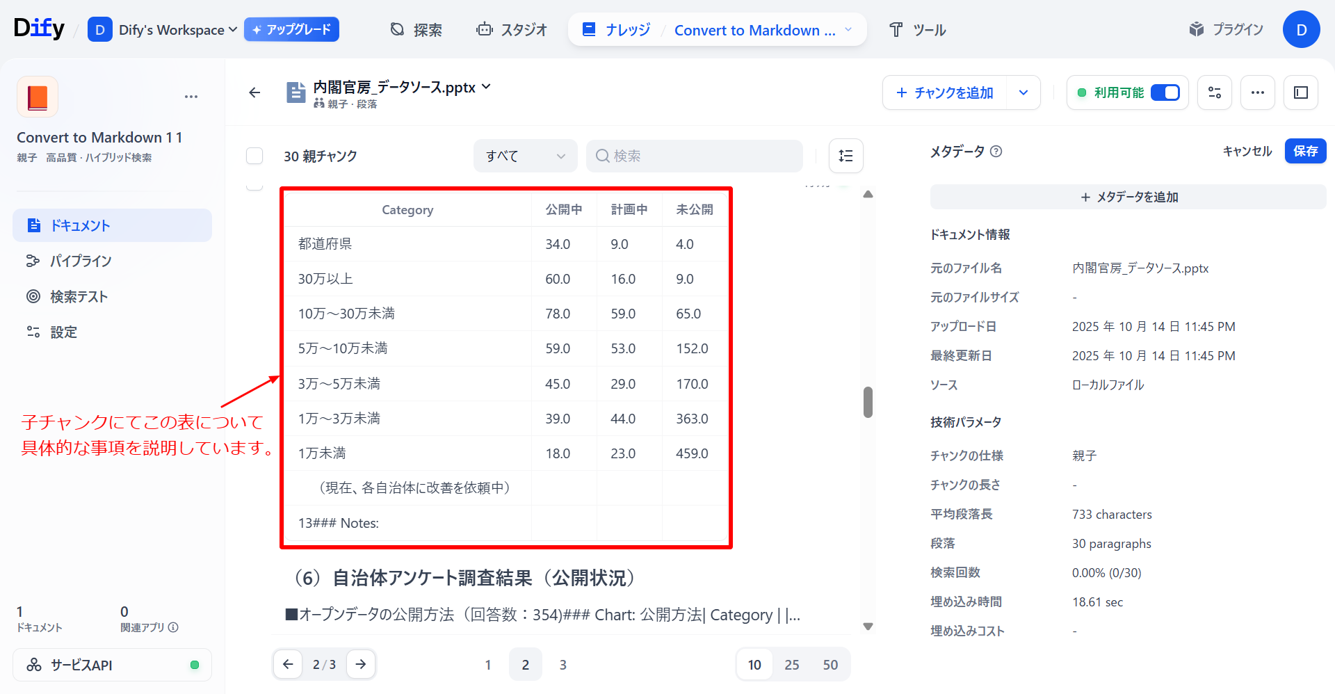 「文書形式変換」によるナレッジベースでは文章だけではなく、表や図形などの情報もナレッジベースとして親子チャンクが生成されています。