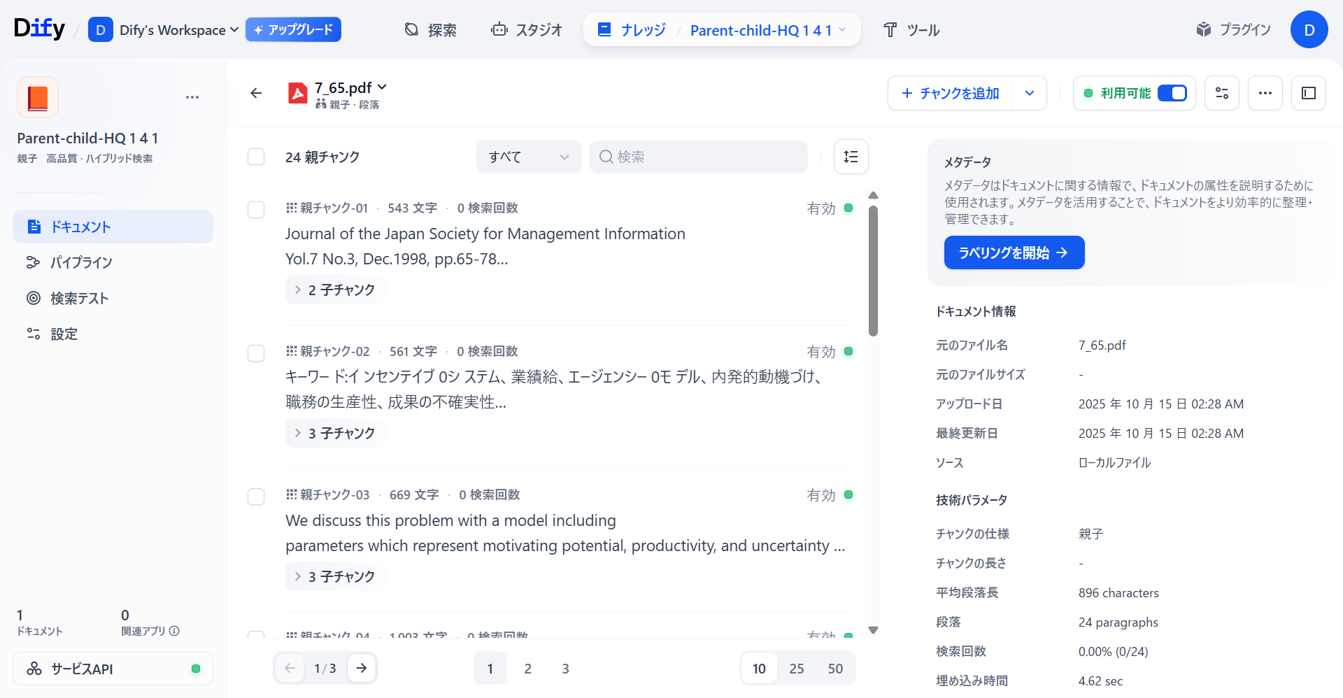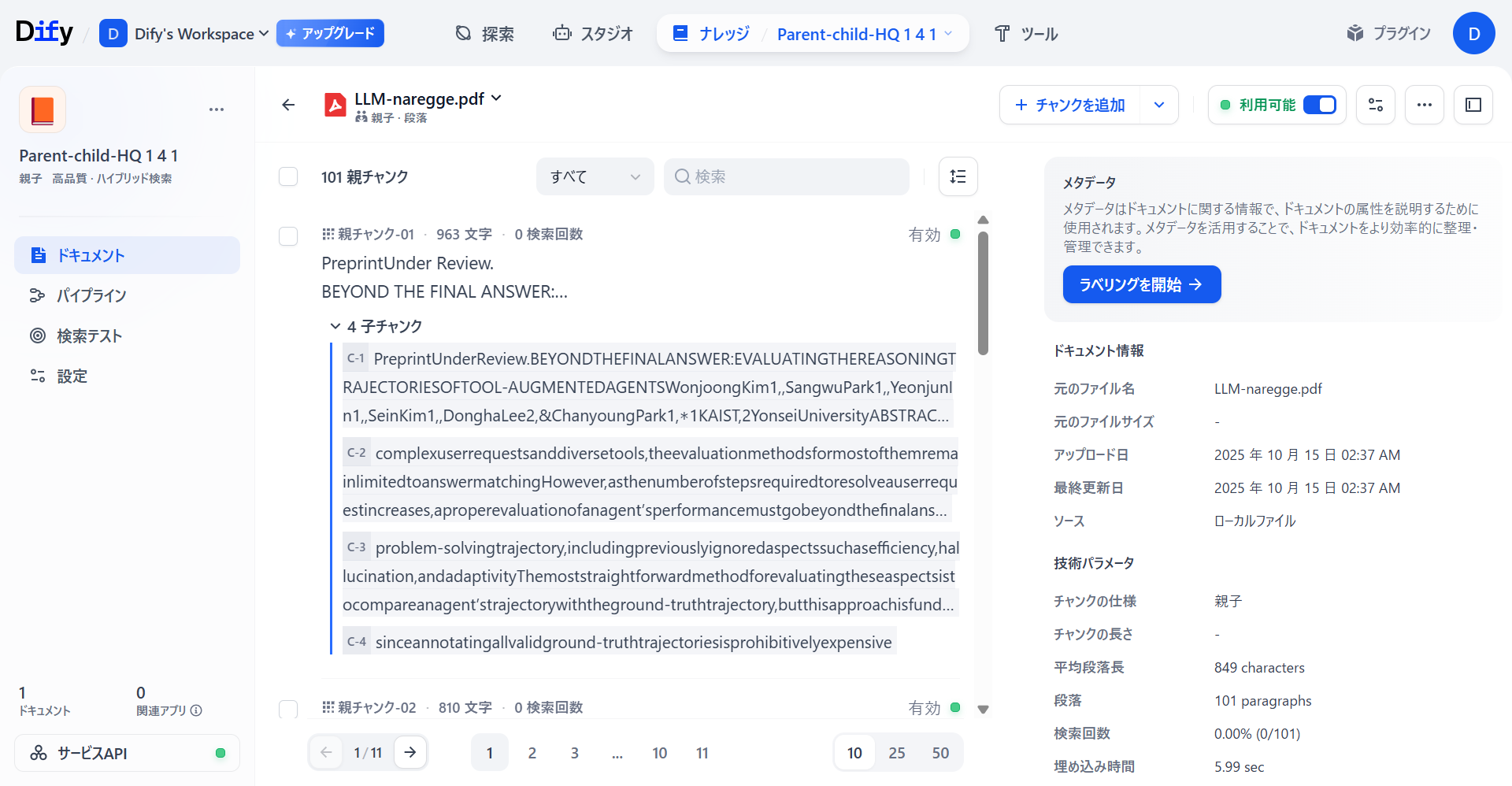 処理が正常に完了したナレッジベースを見てみると「親子チャンク」が正常に生成されていることがわかります。