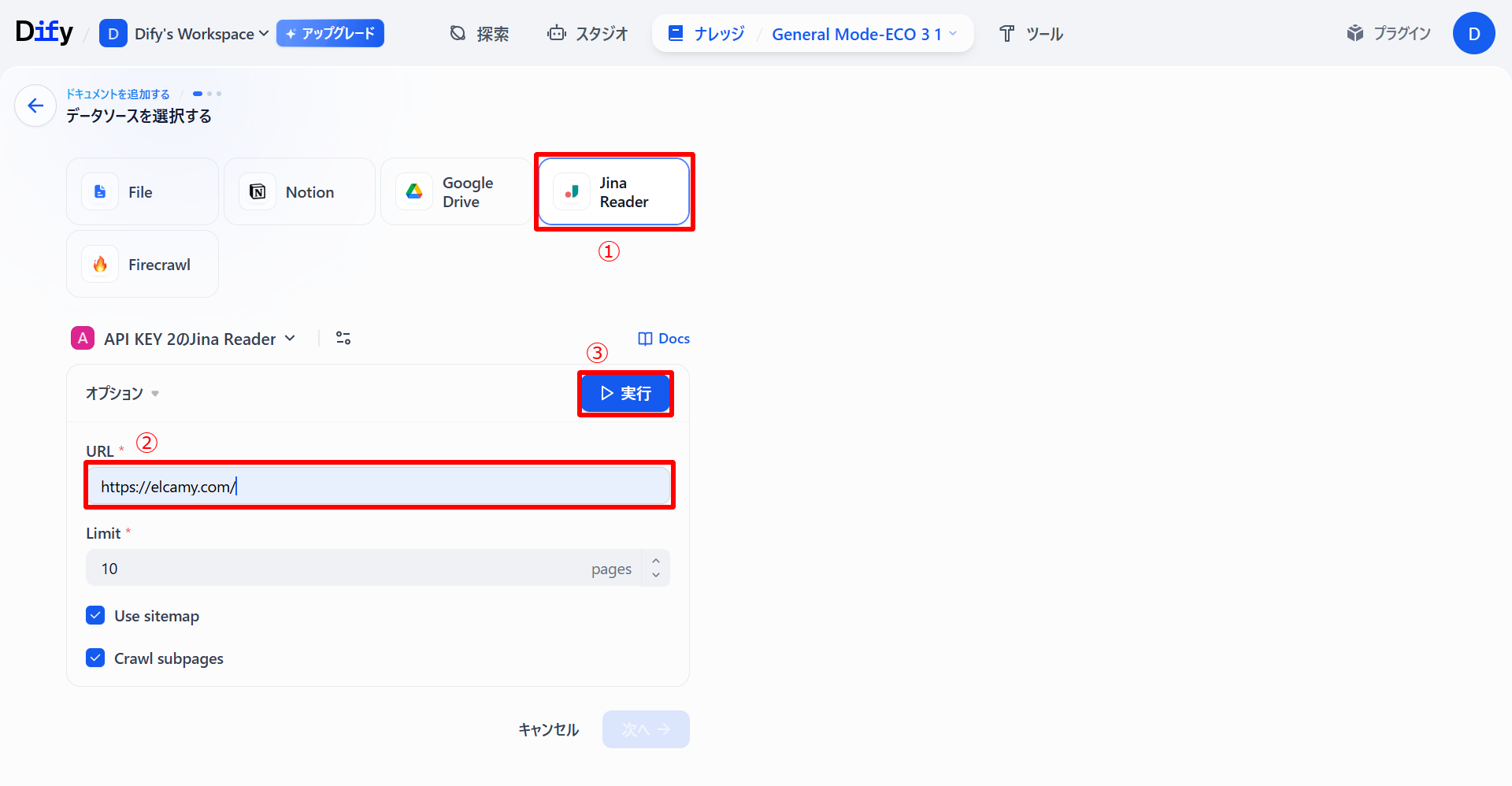 - データソースから「Jina Reader」を選択し、クローリングしたいサイトのURLを画像のように貼り付けます(クローリングページ数の上限「Limits」は10に設定)。
