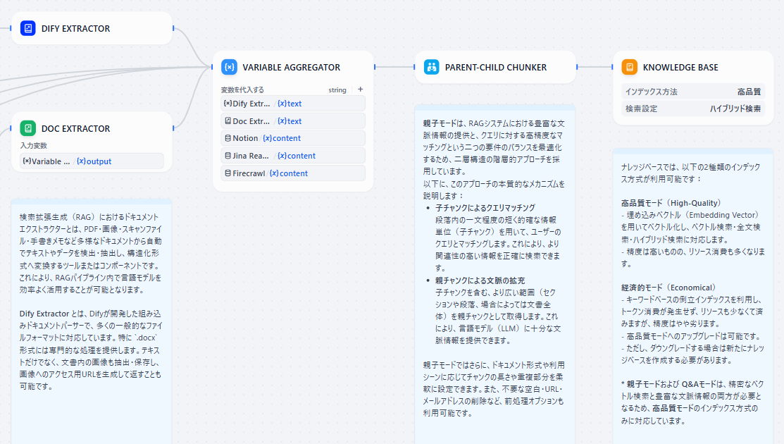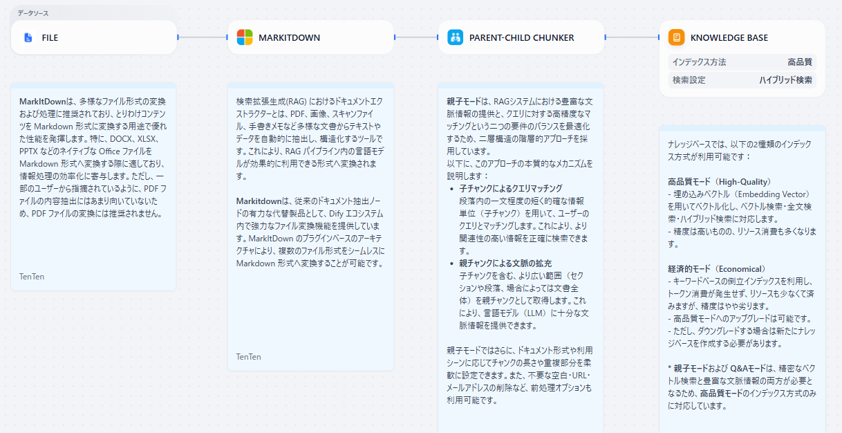 | 長文書処理 | 親子 | 具体的なコンテンツを正確に特定しながら、完全なコンテキストを保持。技術文書や研究レポートなどの長編資料に最適です。 |