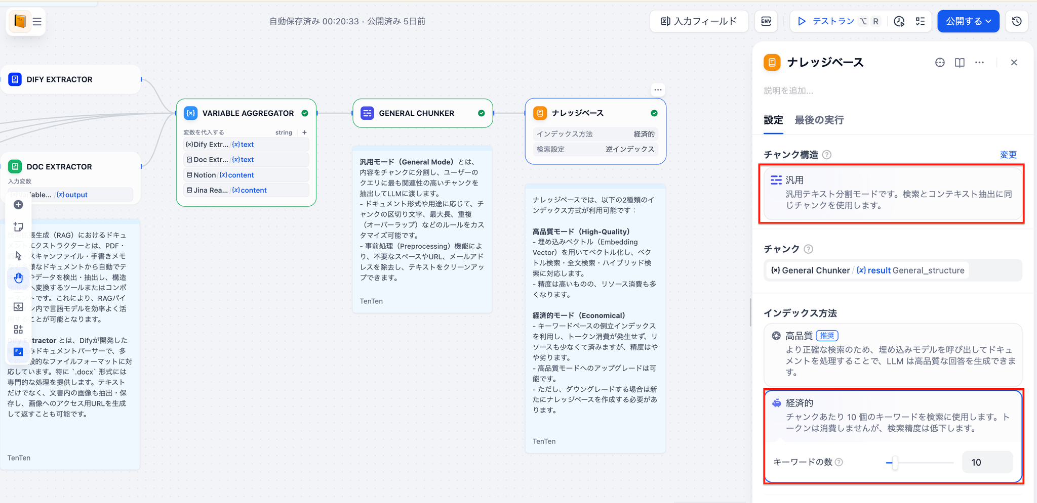 - KNOWLEDGE BASEブロックでチャンク構造を「汎用」に設定し、インデックス方法を指定します。今回は「経済的」を指定します。