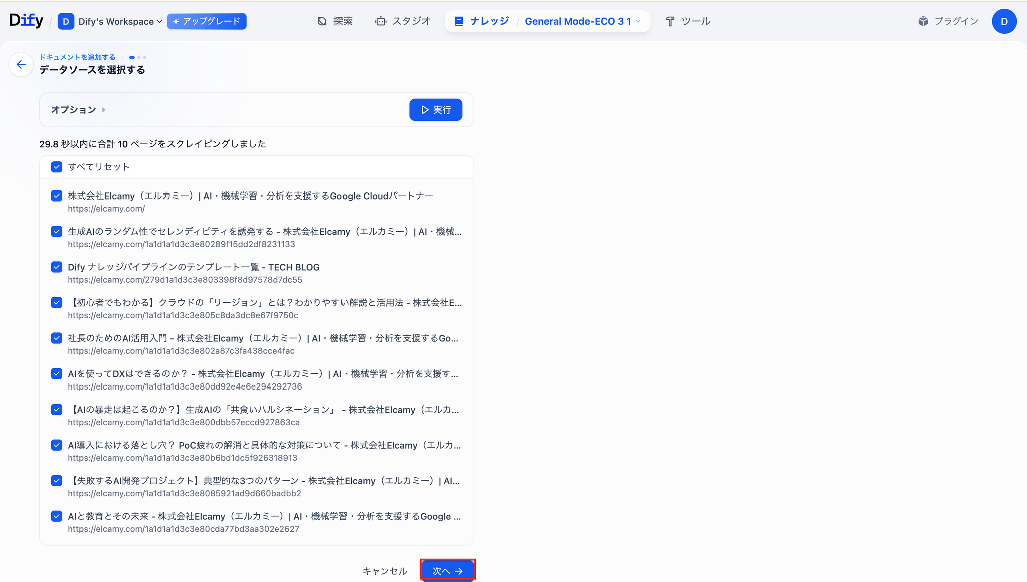 今回はWebクローリングを利用して、Elcamyの公式サイトをクローリングしナレッジベースに保存します。