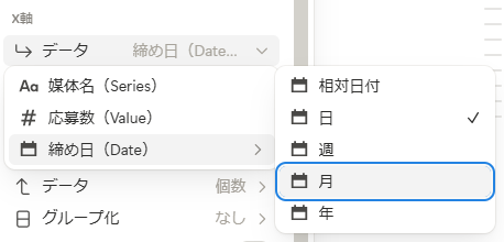 - X軸>データ>Date>「相対日付/月/週/日/年」のいずれか表示したいものを選択