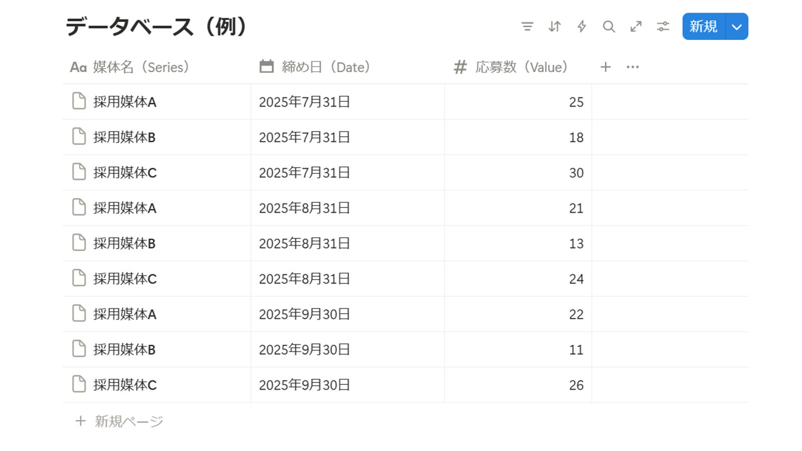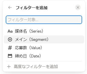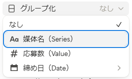 | Series | 🔤テキスト 🔻選択 ≔マルチセレクト など | 媒体名など、線を分けるセレクトプロパティ |