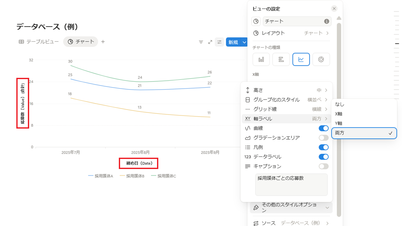 ここで「媒体名」などの項目を指定すれば、その値ごとに別々の線が描かれます。