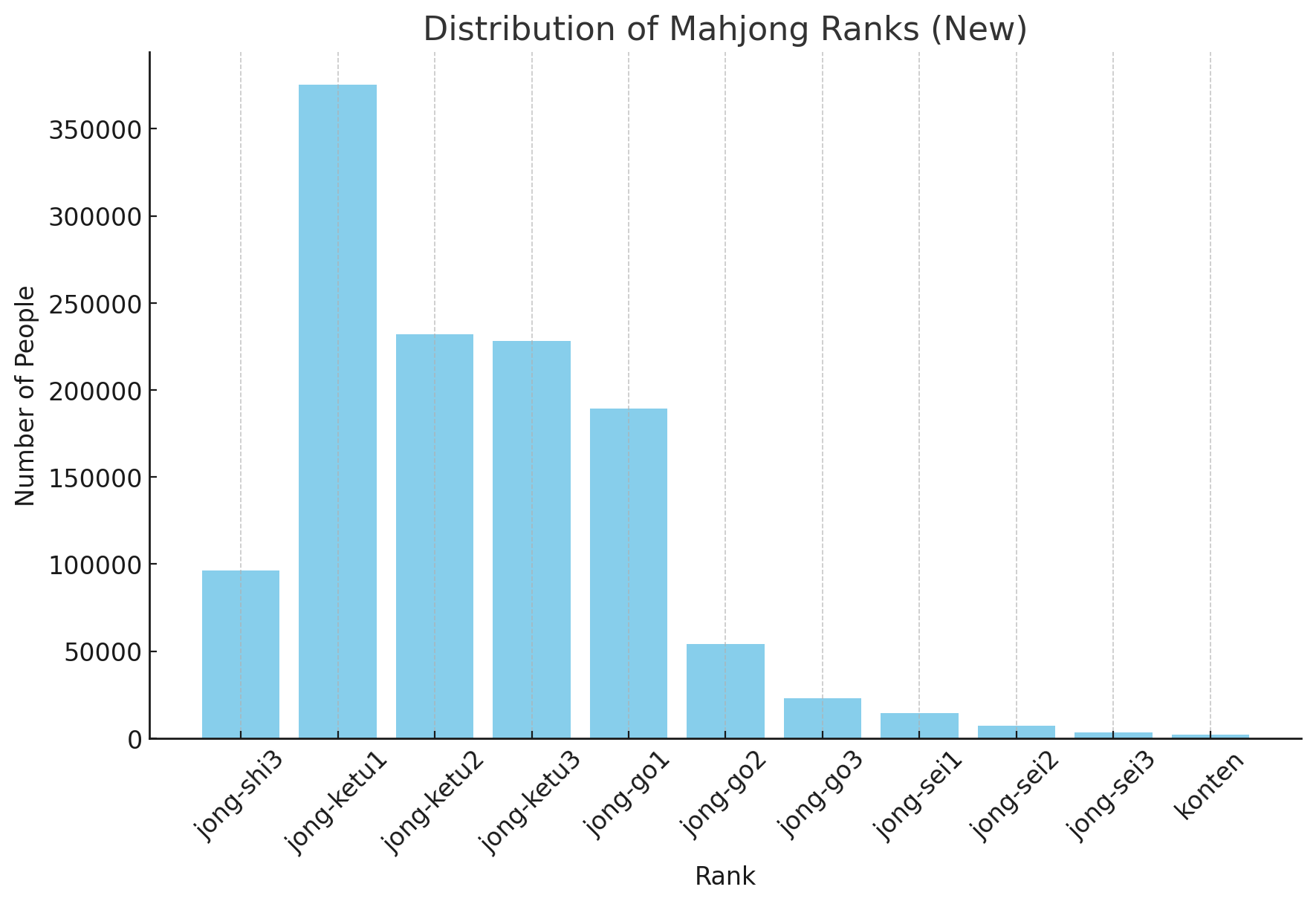 shoshin(初心)、jong-shi1, 2(雀士1, 2)のデータがないせいか、ロケットリーグとは違い、右裾が長い分布になっています。仮にあったとしても尖度は高そうで特徴のある分布と言えそうです。統計学的にこれが麻雀というゲームをどう表しているかの考察は一旦置いておきますが、ぱっと見、jong-sei1(雀聖1)以降は修羅の道になりそうですね。