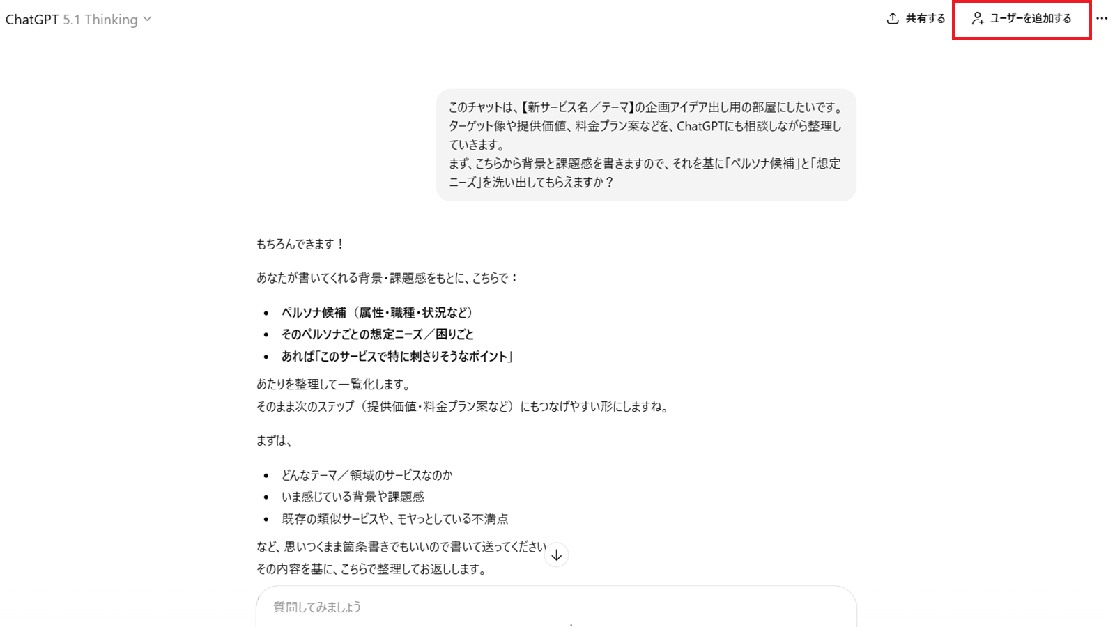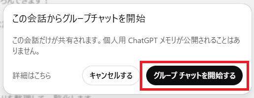 個人でChatGPTと話していたチャットを、そのままチームで共有したくなる場面も多いと思います。そんなときは、既存チャットからグループを作ることもできます。