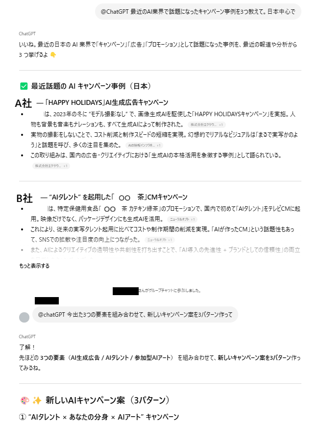 - 「@ChatGPT 今出た3つの要素を組み合わせて、新しいキャンペーン案を3パターン作って」