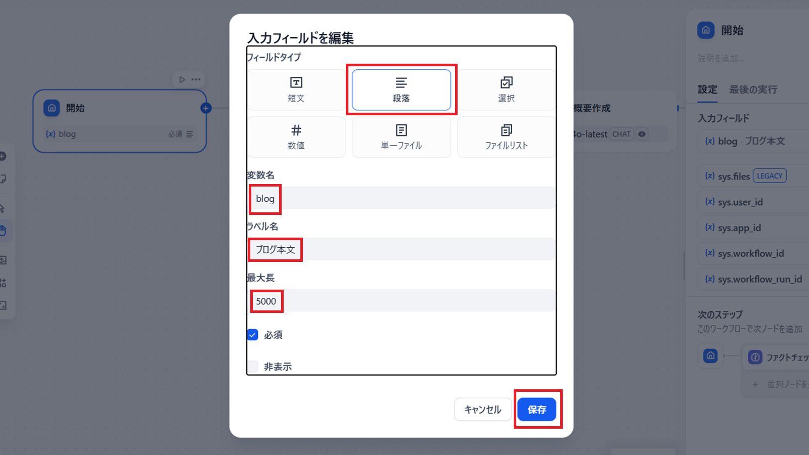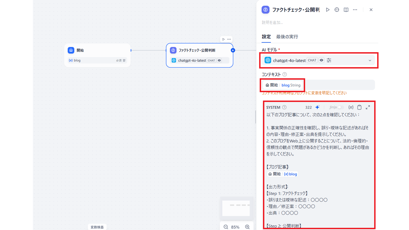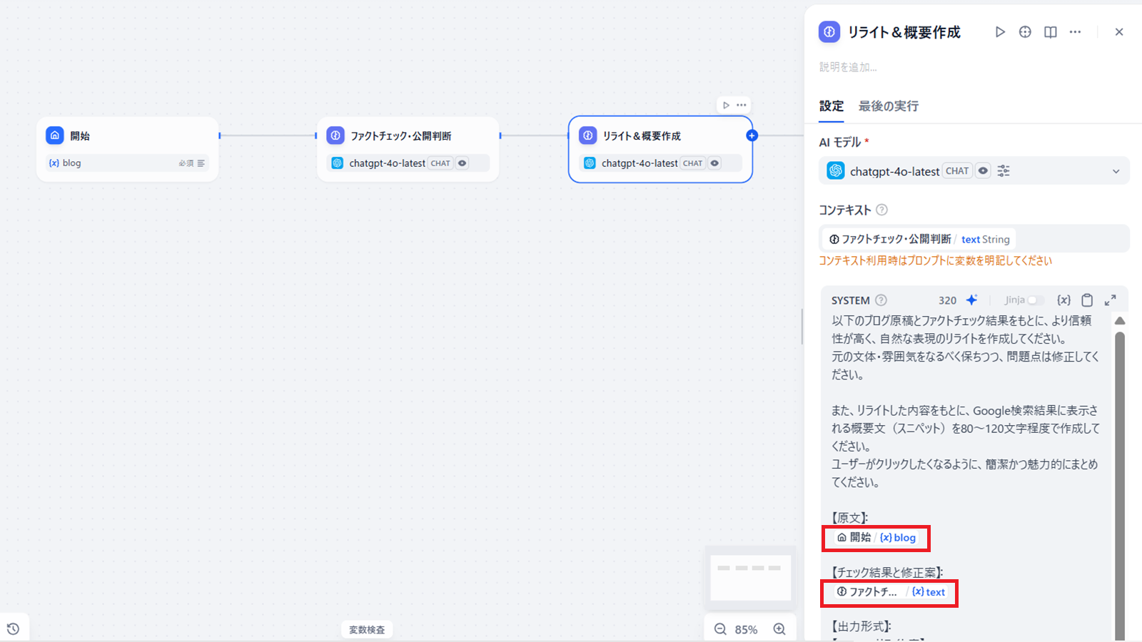 - SYSTEM:LLMノード①の出力結果(=[x]text)をもとに、開始ノードで入力した本文(=[x]blog)をリライトするように「変数」を使用したプロンプトにしています。