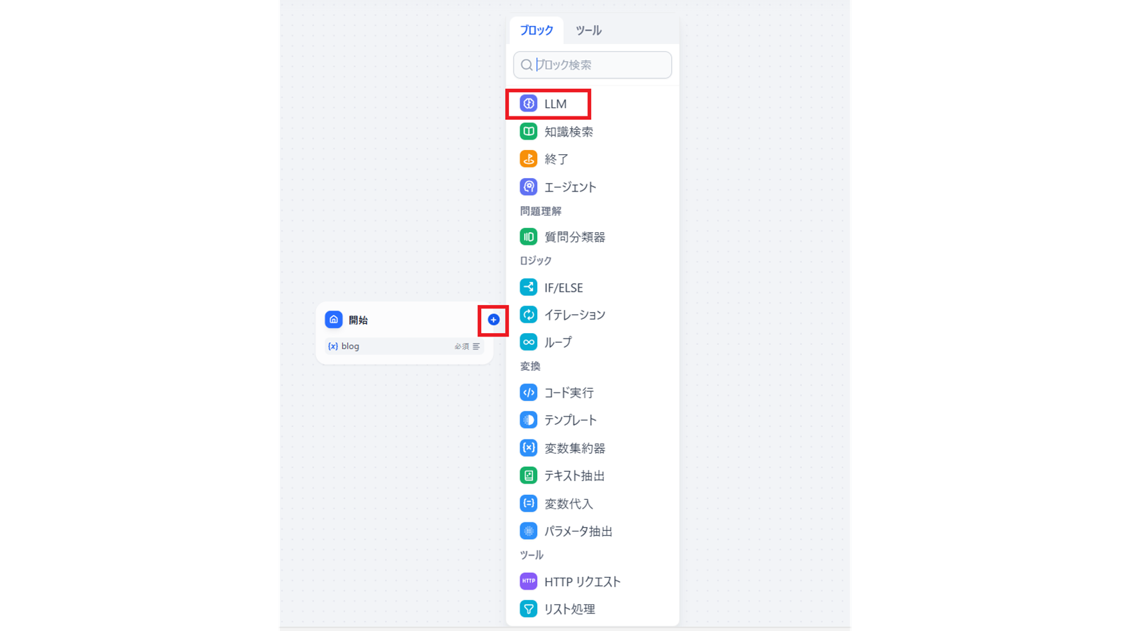 「+」からLLMノード①に続くLLMノード②を作成します。