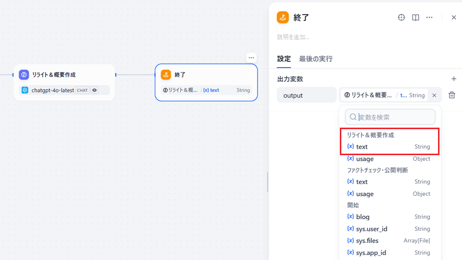 ノードの出力結果(=生成内容)は、「出力変数」から確認できます。