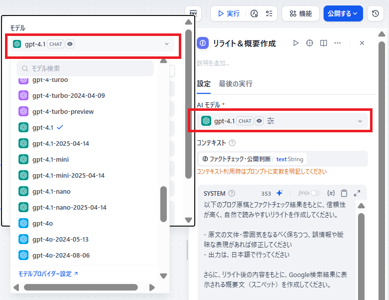 この中で、「ファクトチェック・法的リスクチェック」と「リライト」の処理を担う「LLMノード」において、使用するモデルを以下の3種類に切り替えて比較します。