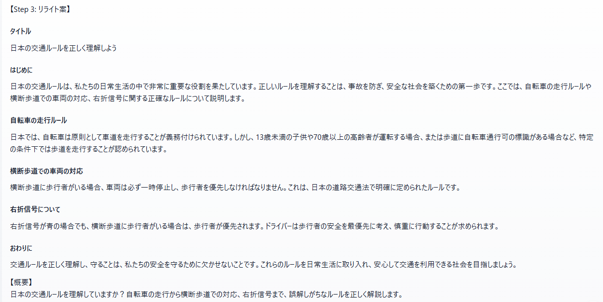 | GPT‑3.5 Turbo | 生成が速くコストが最小。 | 致命的な誤情報(自転車は歩道原則)があり、構成・見出しも不足。ファクト重視のブログには不向き。 |