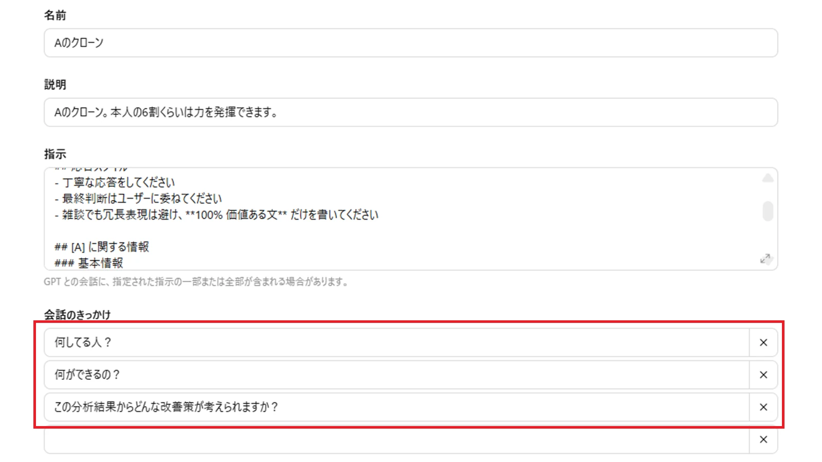 - Builder が「名前」「説明」「会話のきっかけ」を提案してくれる。