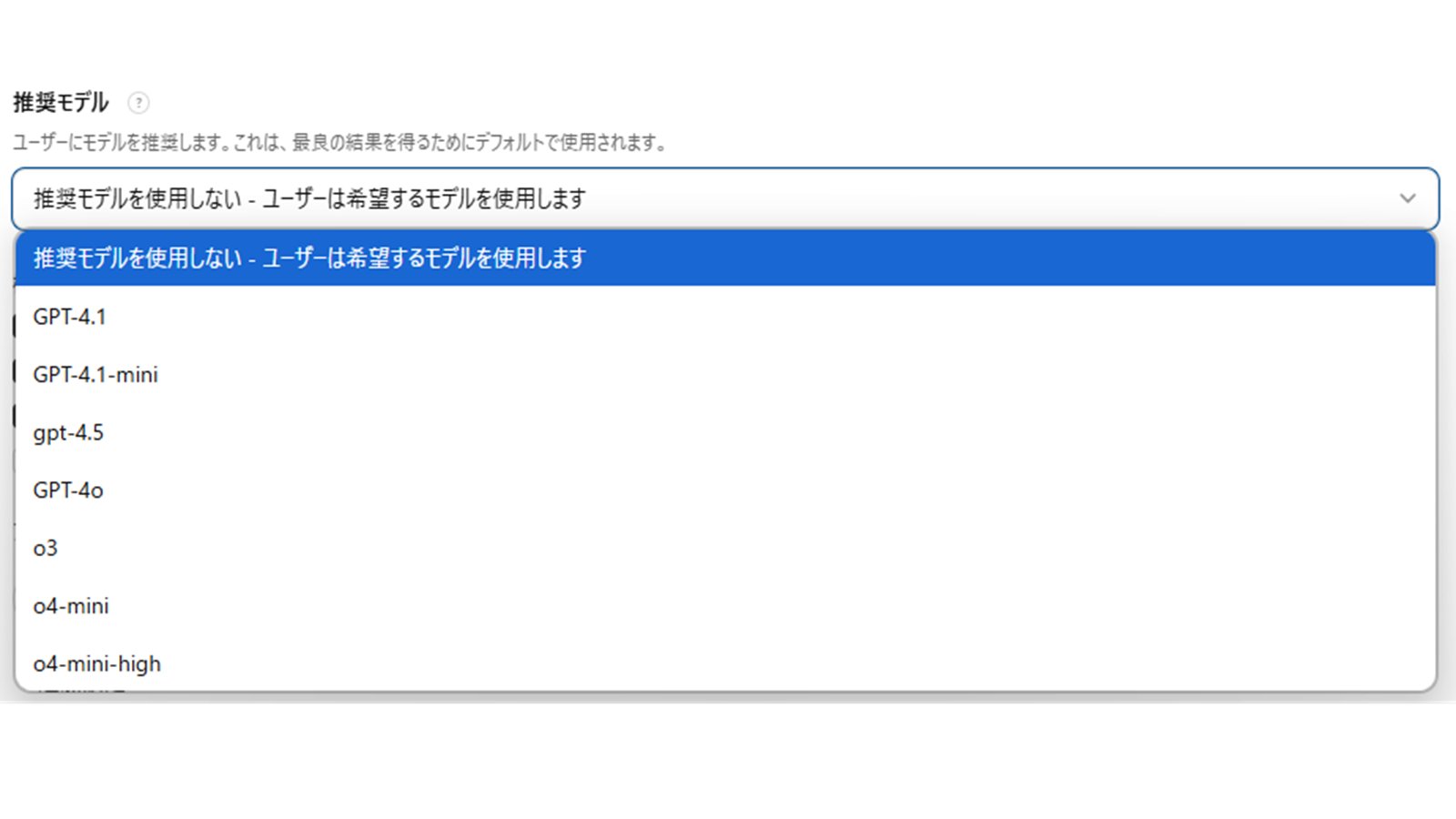 | 5. モデルを選択する | 「モデル」 セクションで GPT-4o や** GPT-o3** など利用したいモデルを選ぶ | 高度な推論などはo3が推奨されるが、負荷軽減やコスト重視なら GPT-4.1mini を選択するなど、目的に応じて選択 |