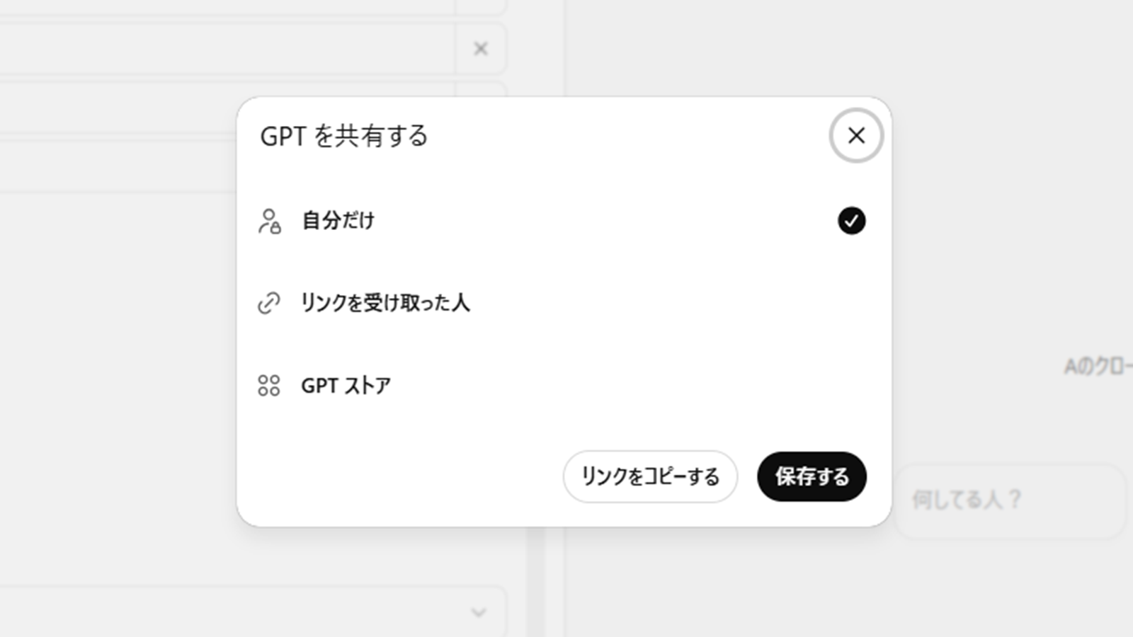 -** 自分だけ** 自分だけが使える非公開モードです。最初はテスト用にこれを選ぶのがおすすめ。 -** リンクを知っている人のみ** URLを共有した人だけが利用できます。社内メンバーや特定の相手との共有に便利です。 -** 全員(GPTストアに公開)** 誰でも検索・利用できる公開モードです。完成度が高くなってから選びましょう。