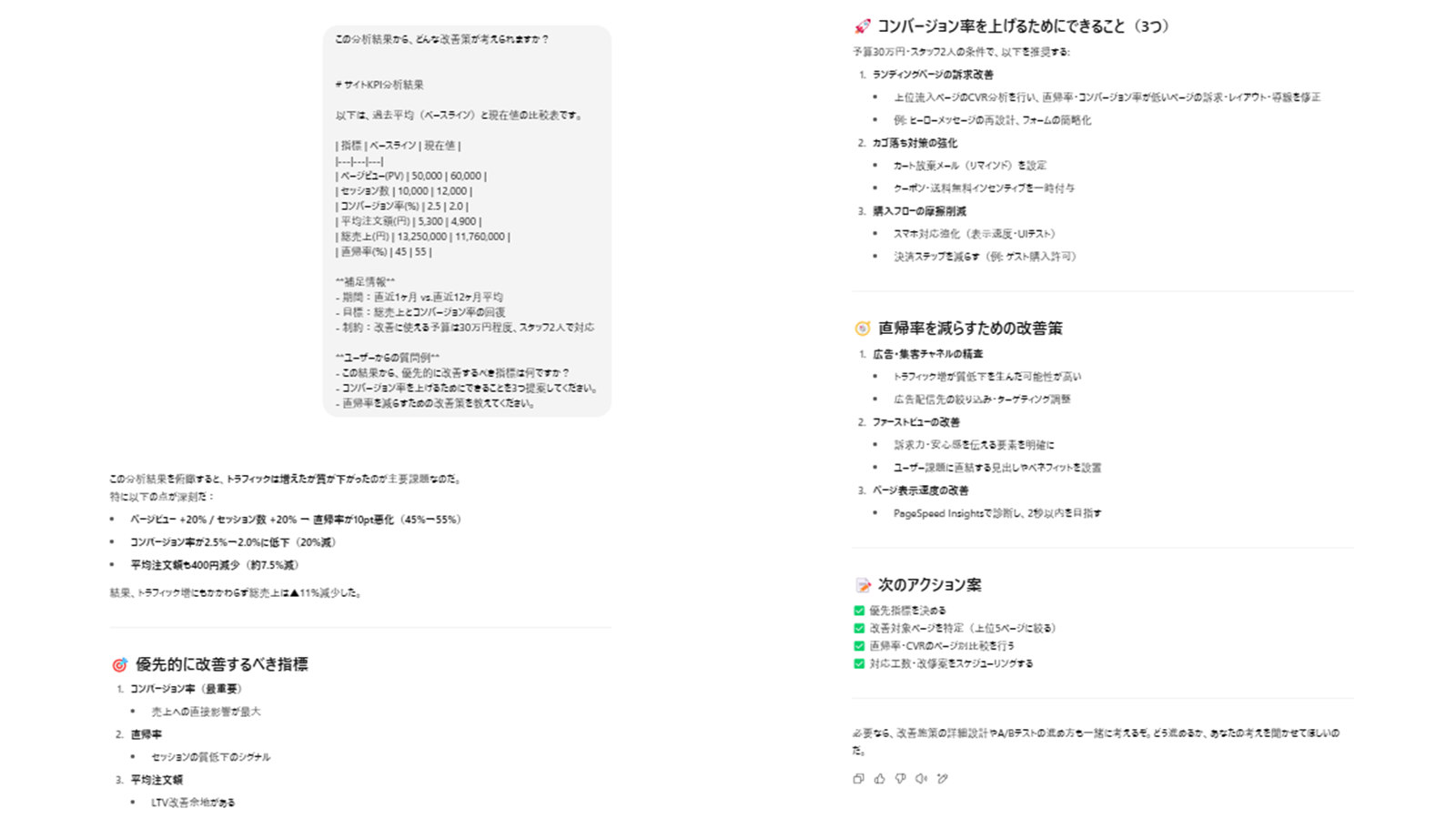 トラフィック増に対して売上が減少している原因を整理し、すぐに実行できる改善案を提案してくれました。