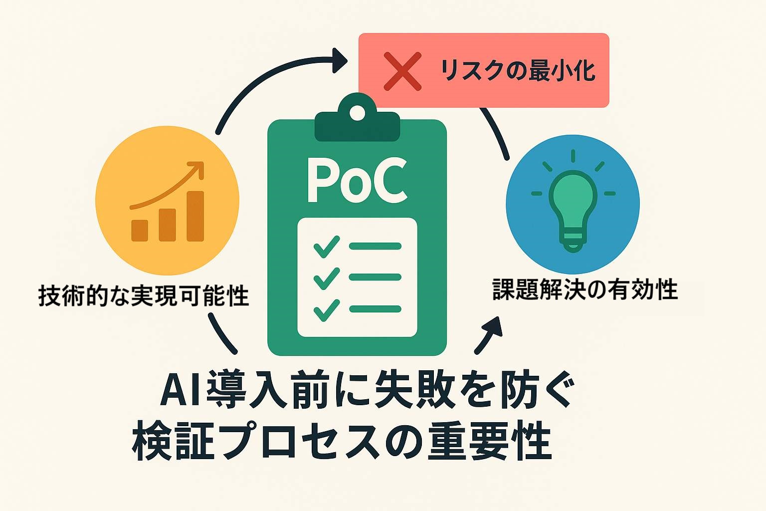 AIの導入を検討するときは、いきなり本格的な実装に進むのではなく、まずは「PoC(Proof of Concept:概念実証)」を実施することが重要です。