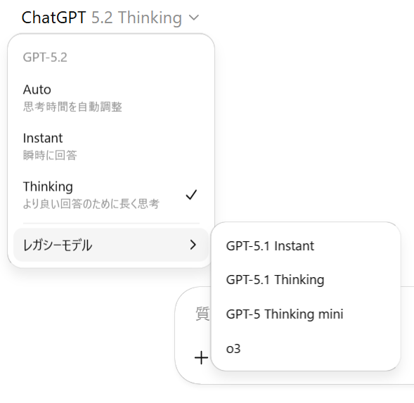 ※ChatGPT の UI では、モード未指定の「GPT-5.2」は GPT-5.2 Auto(Auto が Instant / Thinking を自動切替)を指し、必要に応じて Instant / Thinking を個別に選べます。
