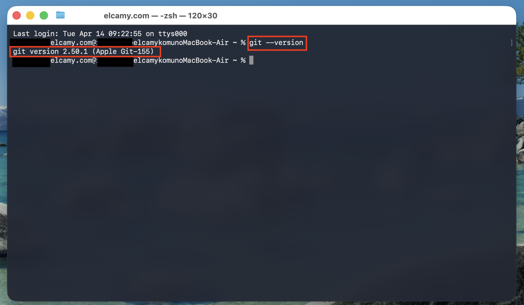 バージョン番号が表示されればOKです。「command not found」と表示された場合は、Git公式サイト からインストールしてください。
