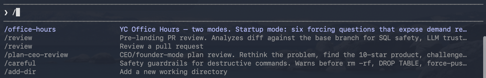 GStackの最大の特徴は、「/plan-ceo-review」「/review」「/ship」のようなスラッシュコマンド(/から始まる命令)を入力するだけで、それぞれの専門家の視点でAIが仕事をしてくれる点にあります。