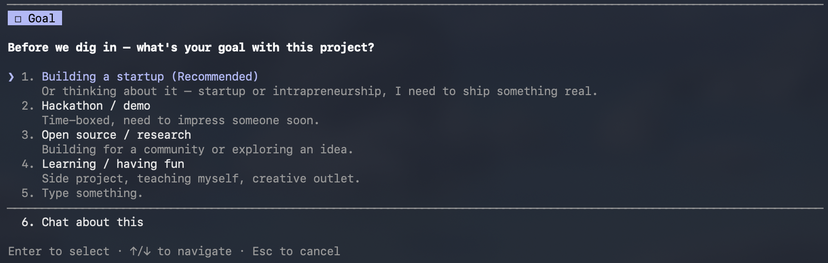 最初に試すのは /office-hours コマンドです。Y Combinator流の「オフィスアワー」を再現するもので、AIが質問を通じてやりたいことを深掘りしながら、設計・実装まで伴走してくれます。
