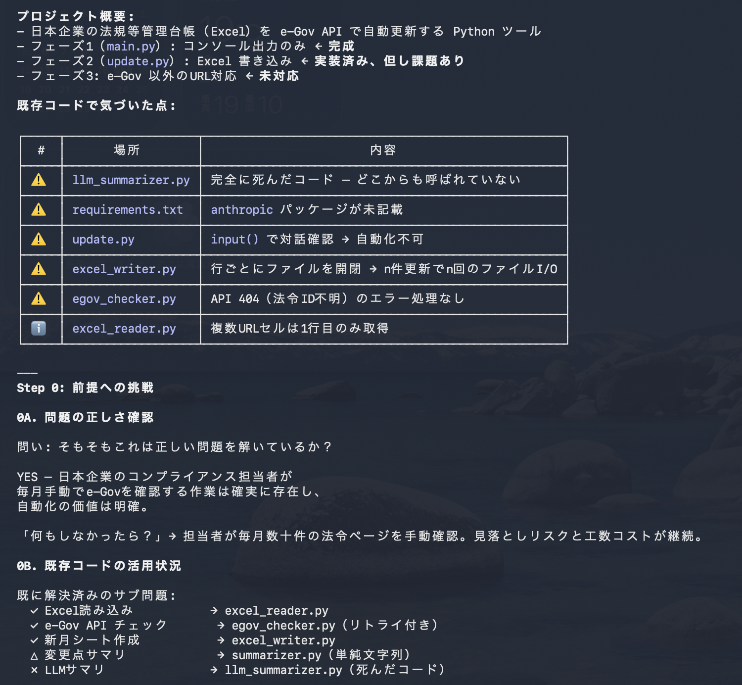 設計が固まった後はそのまま実装へ。egov_checker.py、excel_reader.py、excel_writer.py、main.py の4ファイルが生成され、途中で発覚したPython 3.9の型記法エラーやe-Gov URLの2形式問題(?lawid= 形式と /law/ 形式)もその場で修正。「LLM APIなしでも動く設計にしたい」という途中の方針転換にも対応してもらいました。