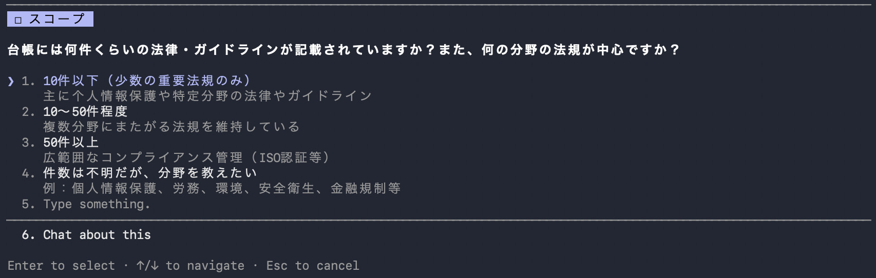 現在のコードとこれまでの会話をもとに、スコープの拡大・縮小・現状維持を整理してくれるため、「やりすぎ」に気づいて立ち戻ることができます。
