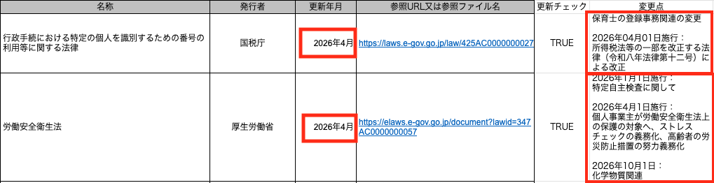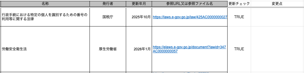 問題は、更新作業がすべて手作業だったことです。担当者がe-Gov(国の法令データベース)のサイトを一件ずつ目視確認し、改正があればExcelに転記する——という流れで、見落としのリスクも、転記ミスのリスクも常にありました。