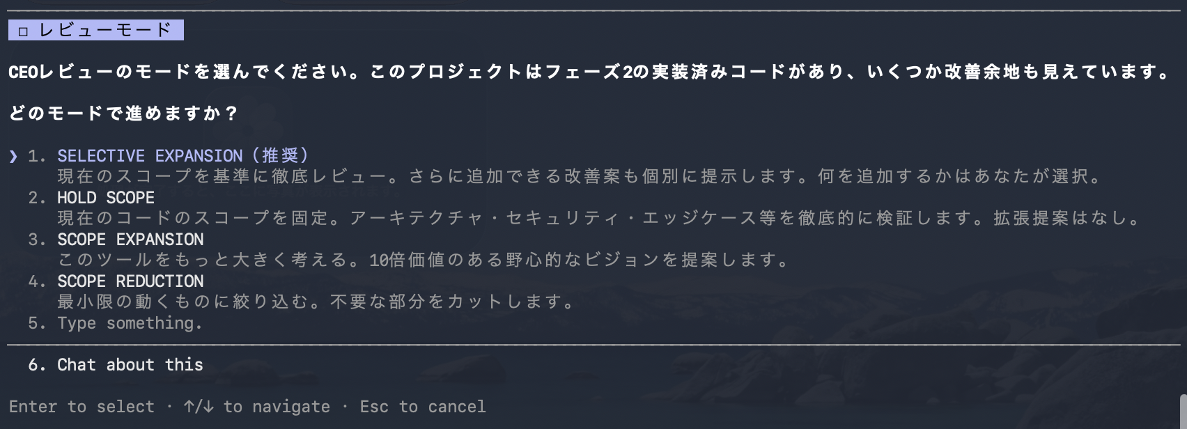 まずレビューのモードを選びます。「スコープを絞るか」「現状維持か」「拡張するか」を選択肢から選ぶだけです。