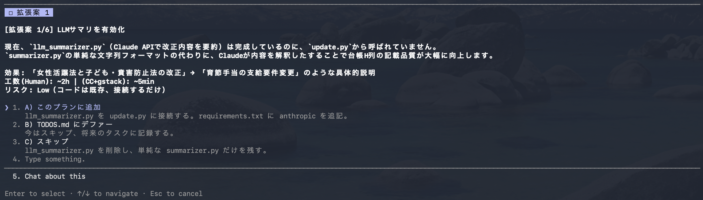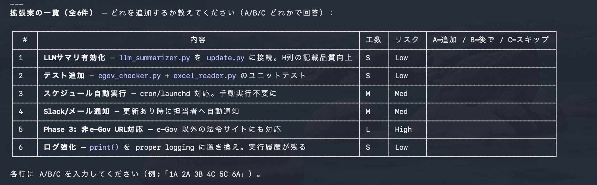 /office-hours で作業を進めていると、気づけば「あれもこれも」と機能が膨らんでいくことがあります。そんな時に使うのがこのコマンドです。
