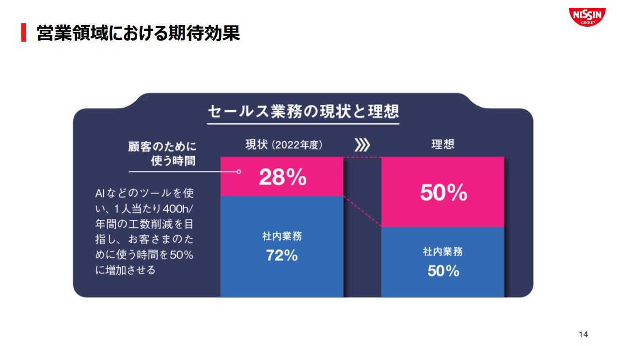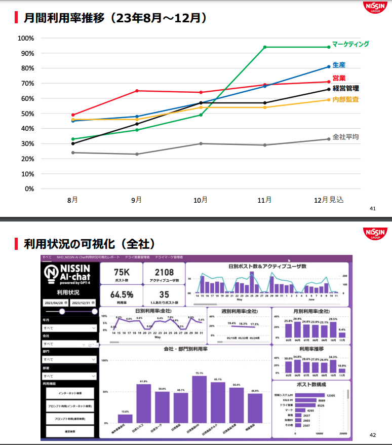 また日清食品は全社で利用を推進し、利用状況を可視化しているようで、営業70%、マーケティングも90%以上が活用しているとのことです。