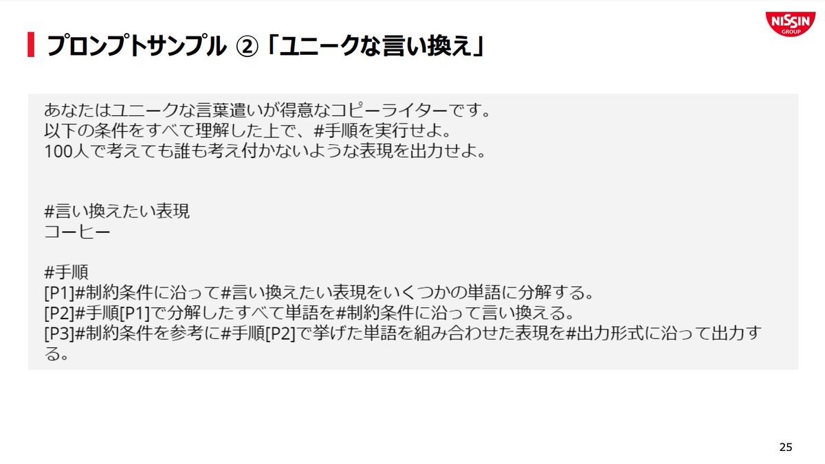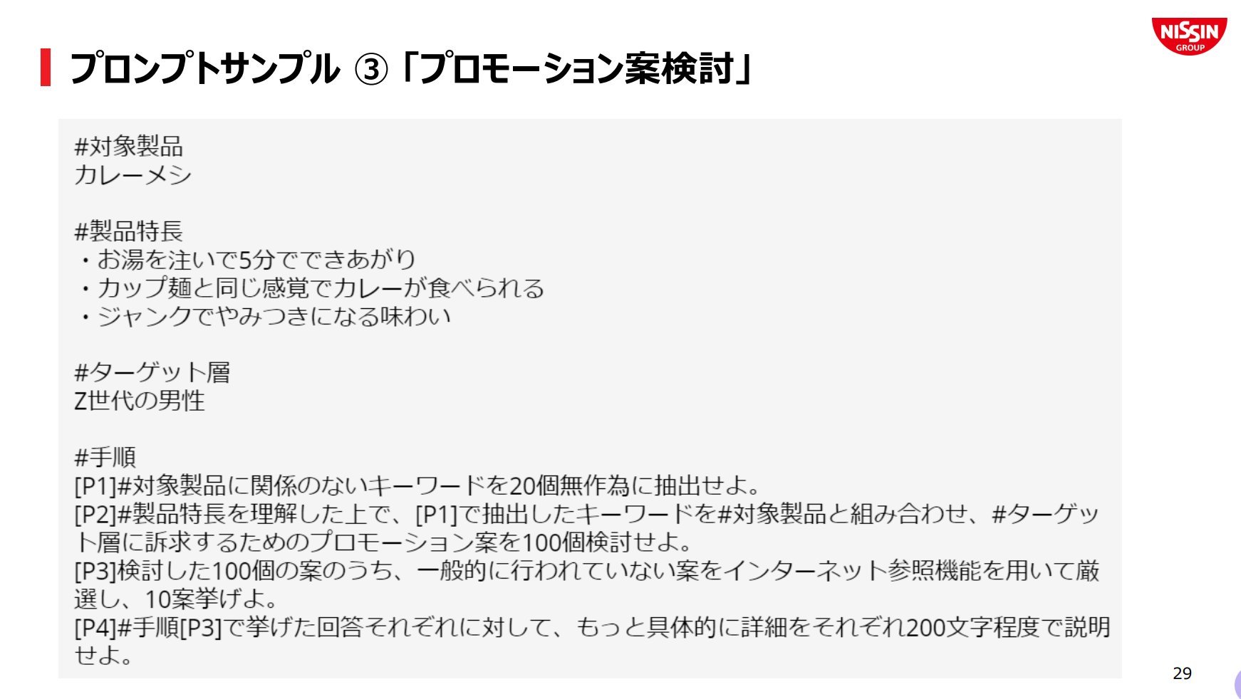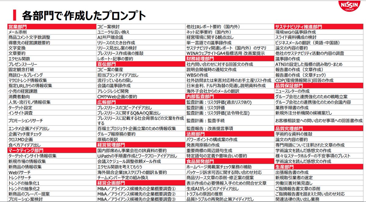 日清食品は生成AI活用の本気度が凄まじく、上記のようなプロンプトの他にも様々なものが紹介されております。