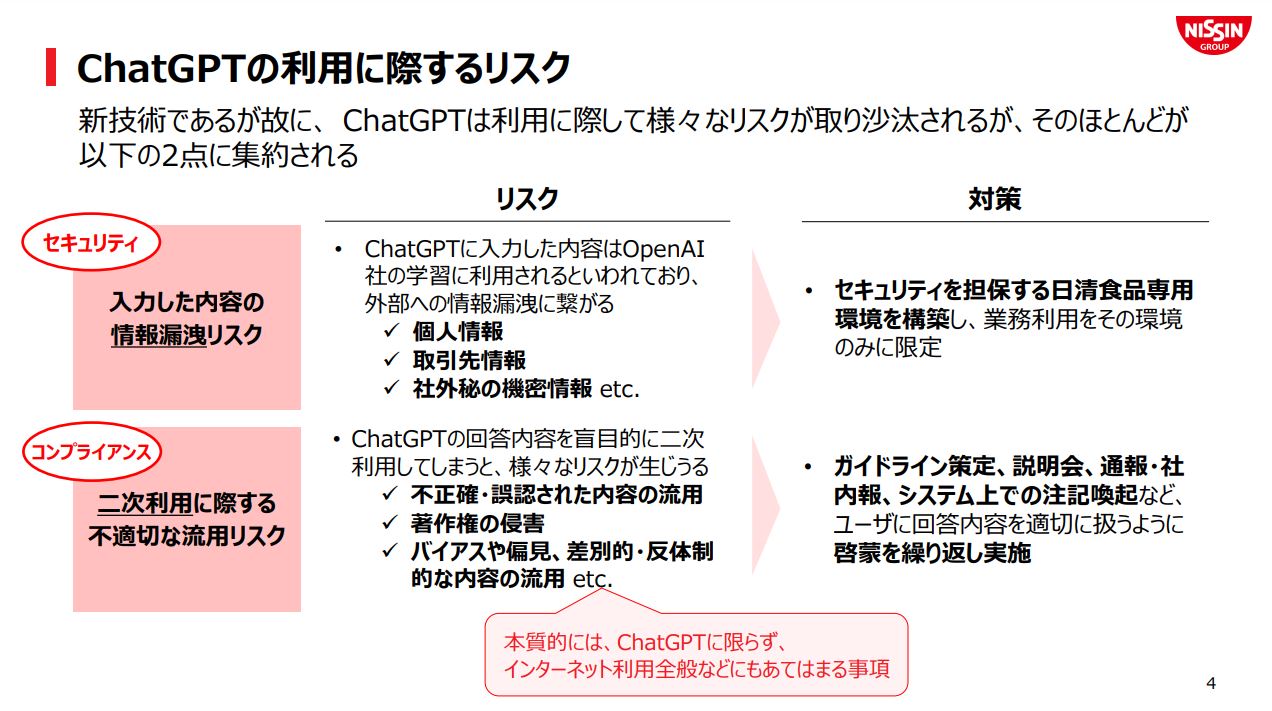 日清食品は、これらの課題にも真摯に向き合い、安全なAI活用のための体制を構築しています。例えば、情報漏洩のリスクを防ぐため、AIの開発や運用を行うための専用環境を構築しています。また、社員がAIを倫理的に活用するためのガイドラインを策定し、研修などを通じて周知徹底を図っています。